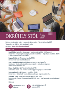 🤝 V stredu 10. decembra 2025 sa na pôde Právnickej fakulty UPJŠ konal ďalší zo série okrúhlych stolov organizovaných Katedrou obchodného práva a hospodárskeho práva, tentoraz na tému Aktu o digitálnych službách.